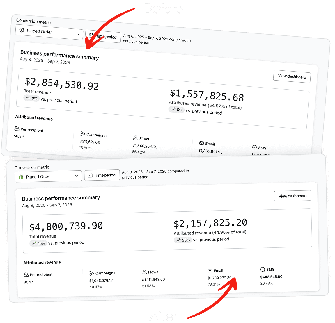 After partnering with us, we increased their pop-up conversion rate from 2% to 4%, lengthened their flows to 3-7 emails, scaled their campaign volume to 3-5 per week, and implemented retention.com to capture additional flow revenue. Today, LuxeDecor generates approximately $1.5M per month through Klaviyo, with email and SMS contributing approximately 58% of total revenue.