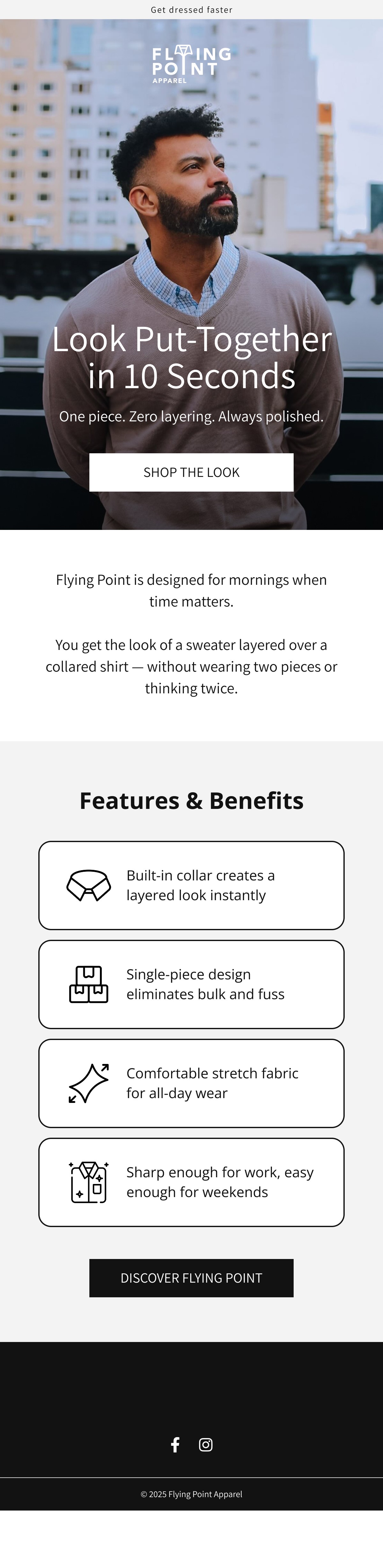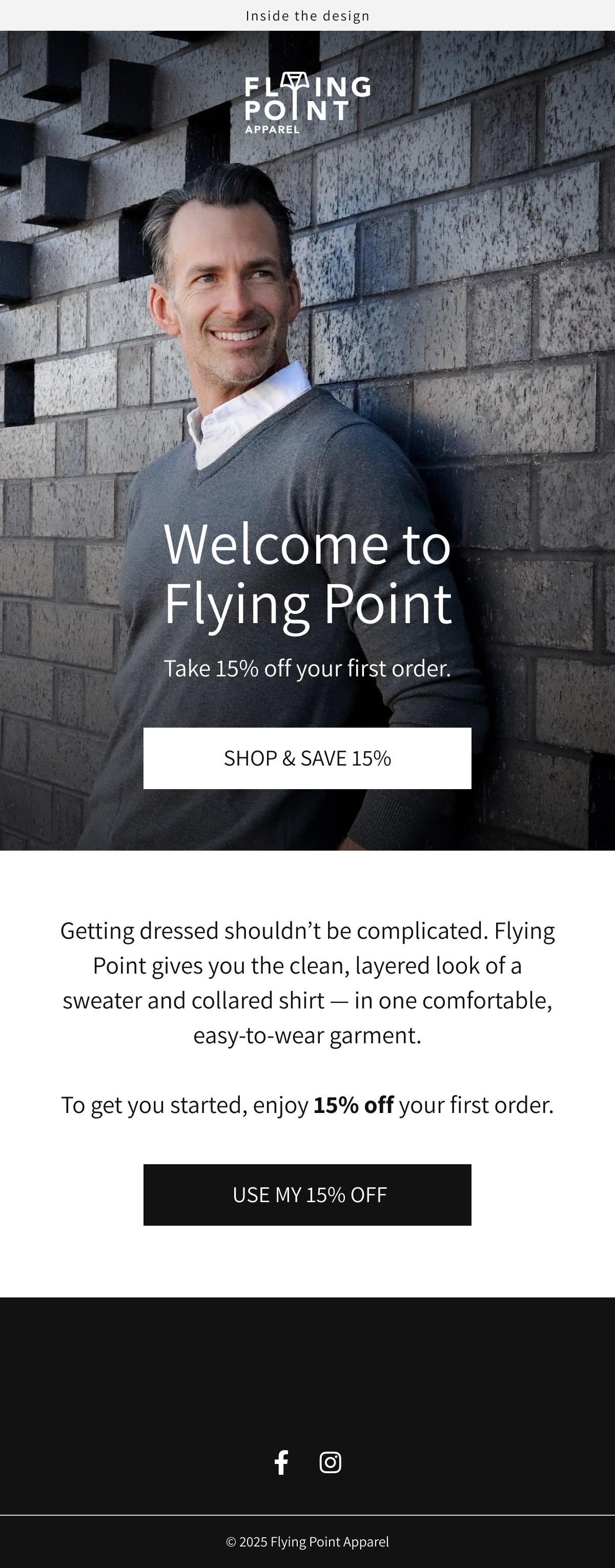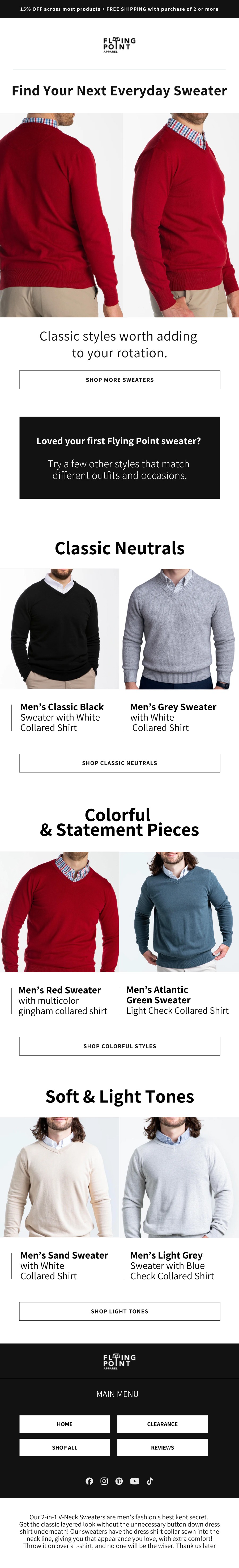 Flying Point Apparel is a men’s apparel brand that solved a common problem for professionals: the hassle of wearing a sweater over a dress shirt. Their innovative two-in-one sweater features a built-in button down collar, giving customers the sharp appearance of layering without the bulk. Prior to working with us, founder Andy was handling email marketing himself whenever he had bandwidth. His approach was ad hoc with no real strategy, and he struggled with the creative aspects like formatting, copy, and messaging. Meanwhile, his primary focus was on Google and Facebook ads, leaving email as an afterthought.