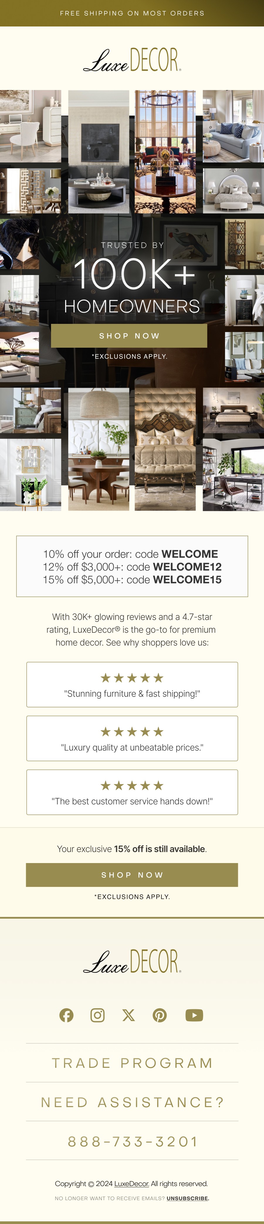 Now going into our third year of partnership, LuxeDecor’s email marketing has evolved from a solid foundation to a highly optimized system generating over $1.5M per month.