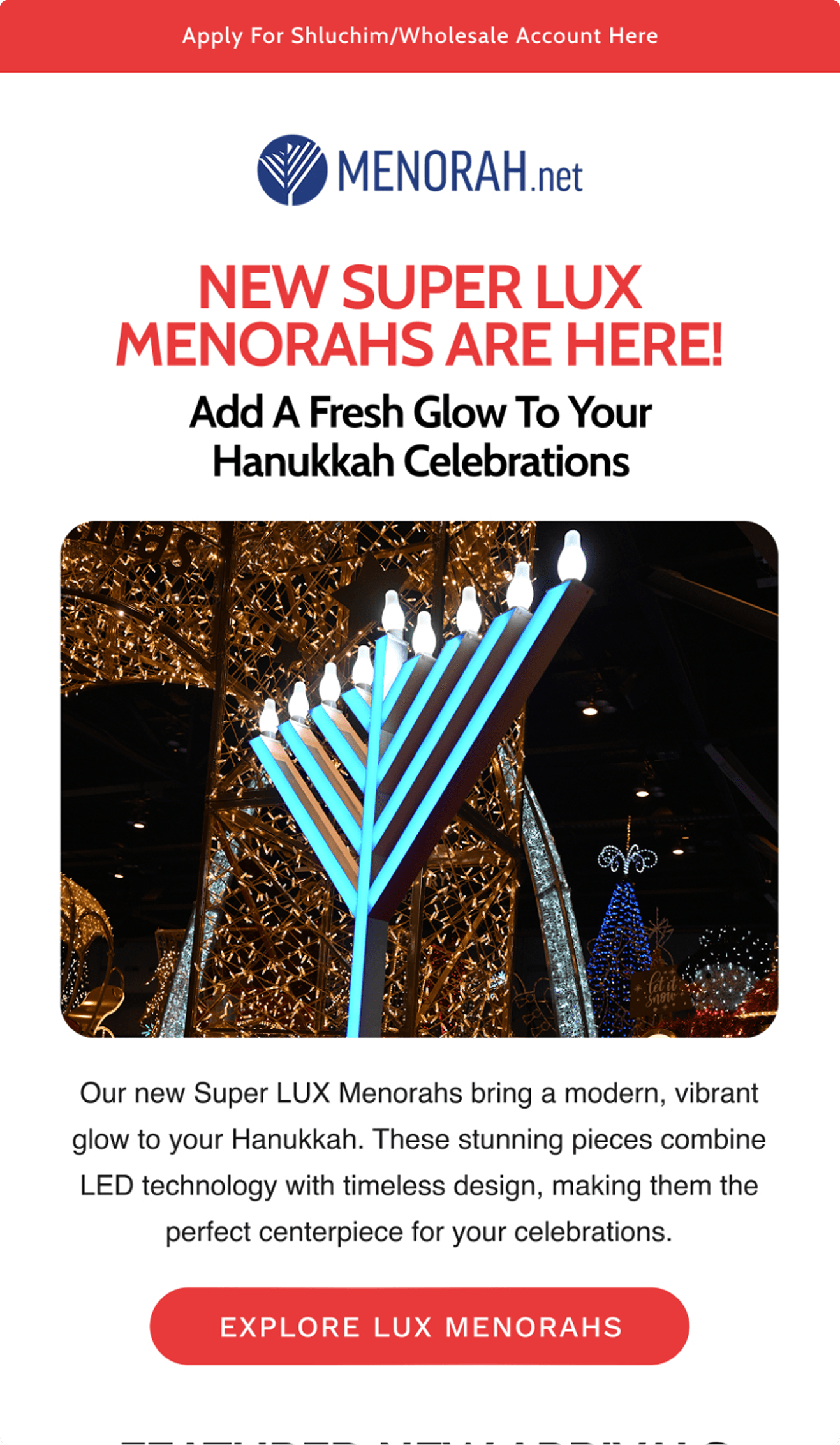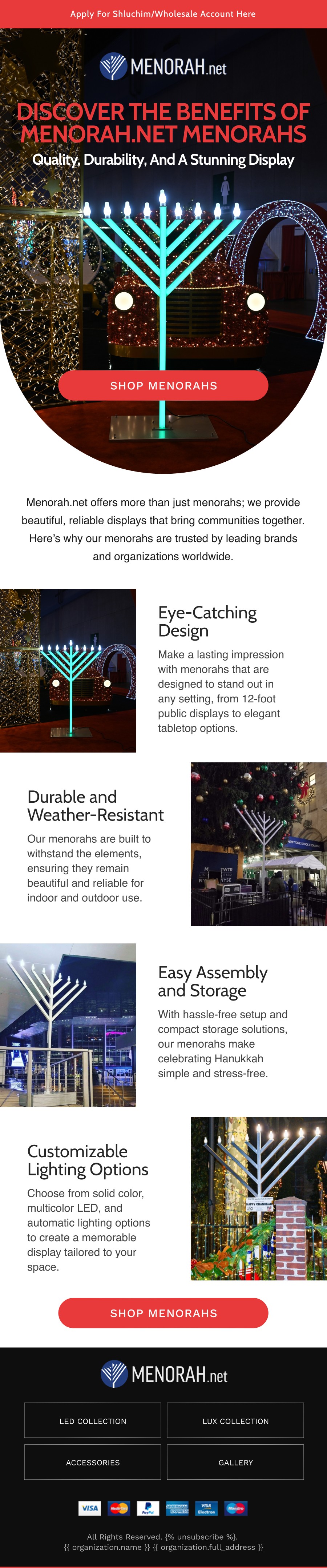 Despite being the world’s largest manufacturer of public display menorahs with an impressive client roster including Miami Heat, Hilton Hotels, Hard Rock Cafe, the Chicago Cubs, Carnival Cruise Line, Bellagio Las Vegas, Norwegian Cruise Line, the Philadelphia Phillies, and the U.S. Army, Menorah.net’s email marketing wasn’t performing at the level it should.